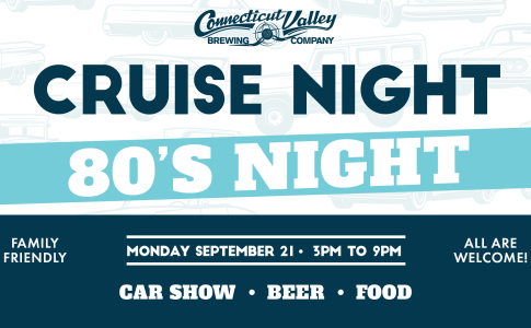 Join us at Connecticut Valley Brewing Company for our CRUISE NIGHT CAR SHOW – Every Monday Night 3-9PM!!! Everyone is welcome at this family-friendly event. Enjoy a beer, grab some food from Birdhouse, and hang out on our spacious patios with firepits. ALL CARS ARE WELCOME at every cruise night, theme or not! Event runs weekly, weather permitting. If cancelled, we will share on the Connecticut Valley Brewing Company Facebook page. This is a family-friendly event. NO BURN OUTS. NO SMOKING. Please be respectful of other guests. Kids must always stay with parents. Dogs must remain leashed and the responsibility of their owners. Nobody under the age of 18 is allowed without a parent and guardian present. All event questions can be emailed to info@ctvalleybrewing.com