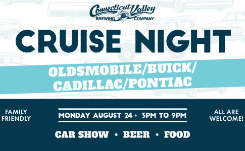 Join us at Connecticut Valley Brewing Company for our CRUISE NIGHT CAR SHOW – Every Monday Night 3-9PM!!! Everyone is welcome at this family-friendly event. Enjoy a beer, grab some food from Birdhouse, and hang out on our spacious patios with firepits. ALL CARS ARE WELCOME at every cruise night, theme or not! Event runs weekly, weather permitting. If cancelled, we will share on the Connecticut Valley Brewing Company Facebook page. This is a family-friendly event. NO BURN OUTS. NO SMOKING. Please be respectful of other guests. Kids must always stay with parents. Dogs must remain leashed and the responsibility of their owners. Nobody under the age of 18 is allowed without a parent and guardian present. All event questions can be emailed to info@ctvalleybrewing.com